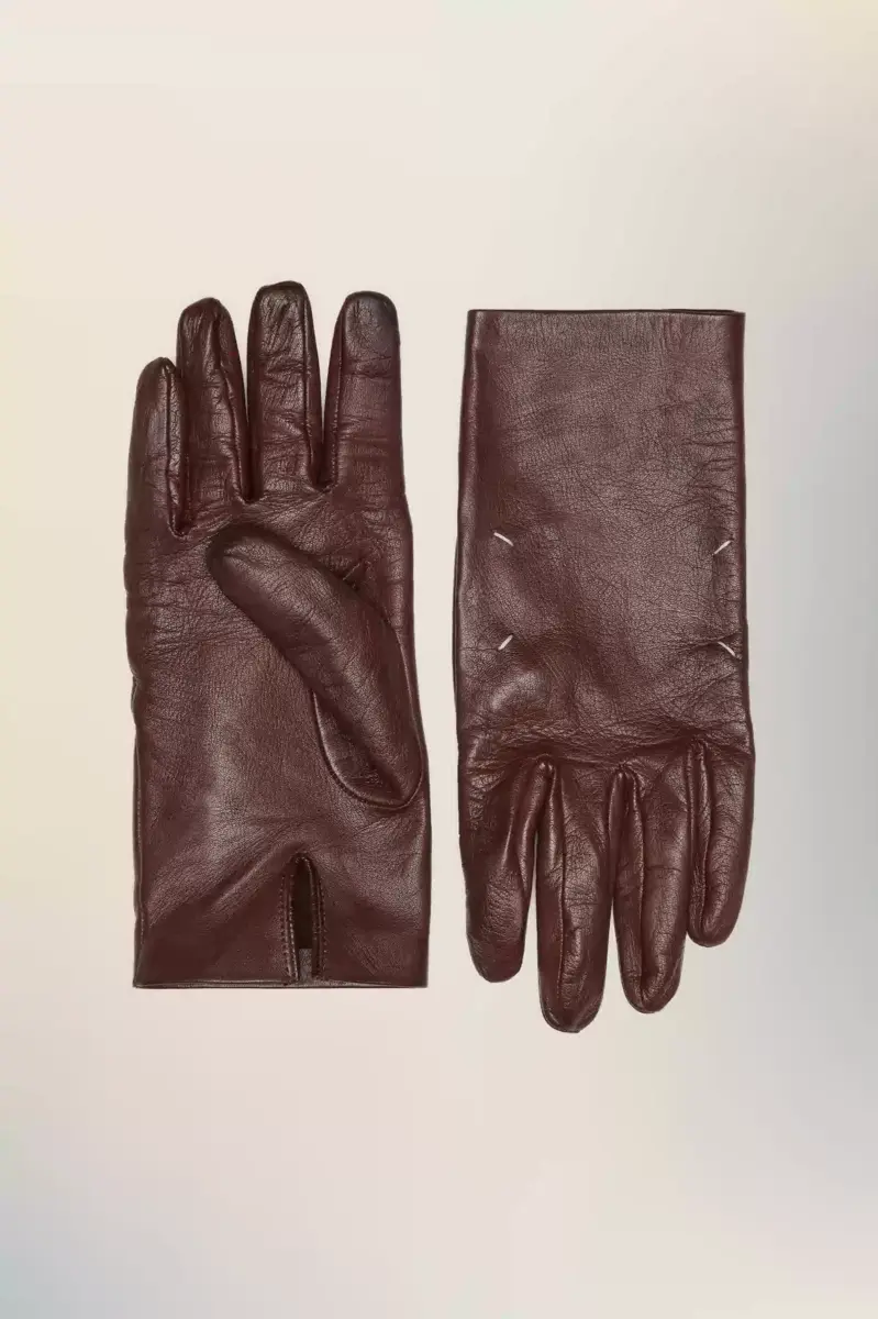 Short gloves made from supple leather. They feature a split wrist for easy wear, and Maison Margiela’s signature, the Four stitches, appear on the top; the opposite of a label.
