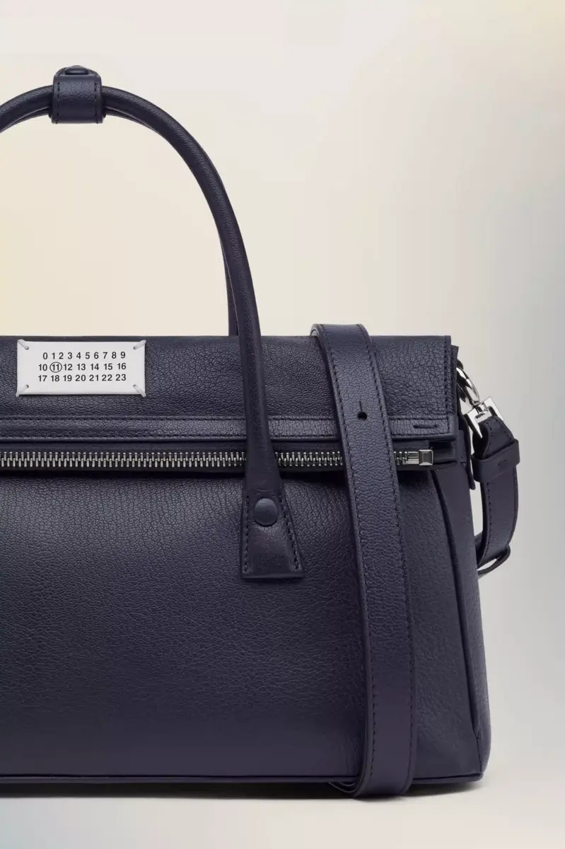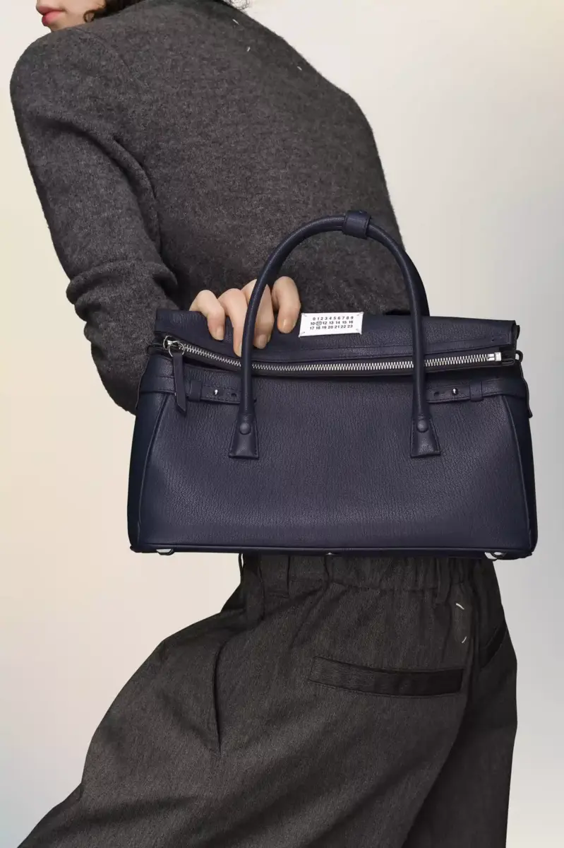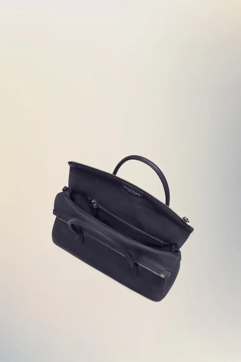 The 5AC East West takes Maison Margiela’s signature 5AC handbag and infuses an Informal Formality mood. Crafted from goat leather, it features top handles and a fold-over design. It is accented with the logo label at the front. The iconic 5AC line takes its name from the French word ‘sac’ (bag). The East West variation is the latest addition to the 5AC family of subverted modern classics, revisited in an elongated size with more volume. Modelled on a men’s briefcase, with a horizontal shape that inspired its name, the bag can be worn by hand, over the shoulder or crossbody. The style continues to explore the Maison’s Anonymity of the lining concept to reveal its internal structure.